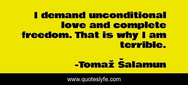 This page presents the quote "I demand unconditional love and complete freedom. That is why I am terrible.". Author of this quote is Tomaž Šalamun. .