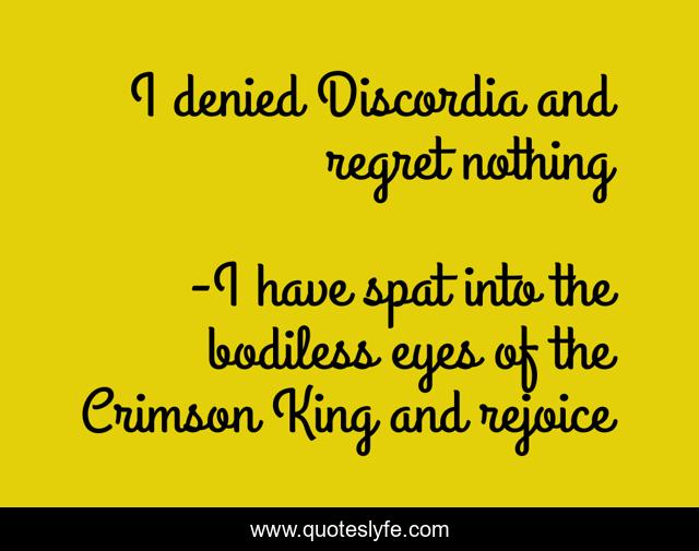 "I have spat into the bodiless eyes of the Crimson King and rejoice Quotes." Quoteslyfe.com, 2025. Sun. 07 Dec. 2025. <https://www.quoteslyfe.com/quote/I-denied-Discordia-and-regret-nothing-202894>.