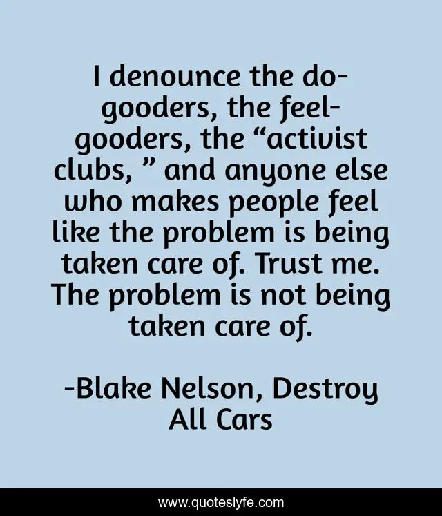 This page presents the quote "I denounce the do-gooders, the feel-gooders, the “activist clubs, ” and anyone else who makes people feel like the problem is being taken care of. Trust me. The problem is not being taken care of.". Author of this quote is Blake Nelson, Destroy All Cars. This quote is about humor, life, satire,.