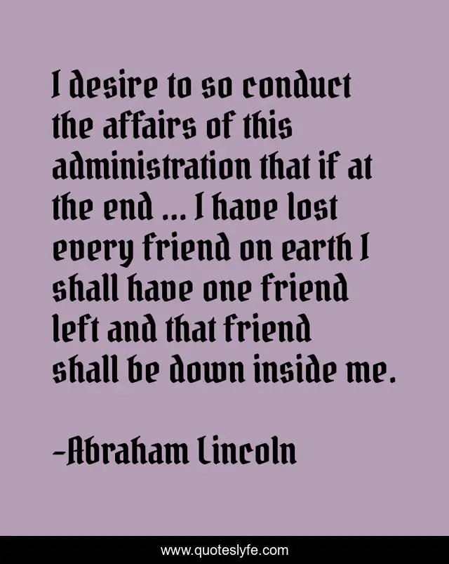 This page presents the quote "I desire to so conduct the affairs of this administration that if at the end ... I have lost every friend on earth I shall have one friend left and that friend shall be down inside me.". Author of this quote is Abraham Lincoln. .
