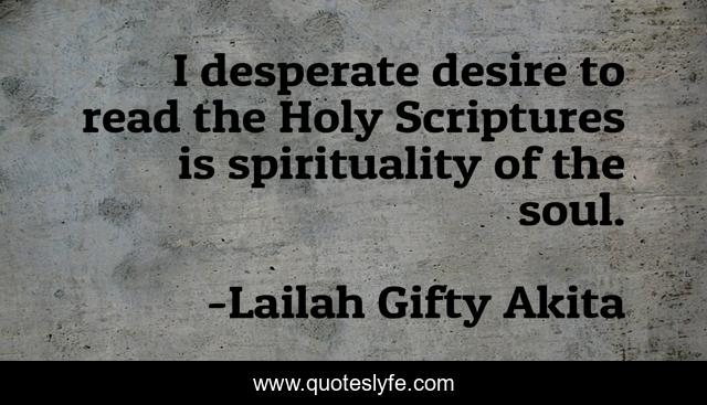 This page presents the quote "I desperate desire to read the Holy Scriptures is spirituality of the soul.". Author of this quote is Lailah Gifty Akita. This quote is about bible-reading, self-awareness, spirituality,.