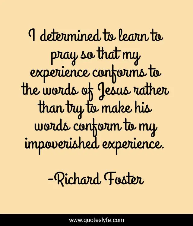 This page presents the quote "I determined to learn to pray so that my experience conforms to the words of Jesus rather than try to make his words conform to my impoverished experience.". Author of this quote is Richard Foster. .