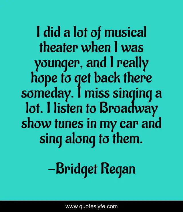 This page presents the quote "I did a lot of musical theater when I was younger, and I really hope to get back there someday. I miss singing a lot. I listen to Broadway show tunes in my car and sing along to them.". Author of this quote is Bridget Regan. This quote is about singing, hope, listen,.