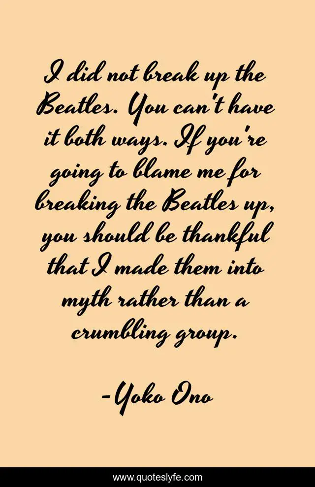 This page presents the quote "I did not break up the Beatles. You can't have it both ways. If you're going to blame me for breaking the Beatles up, you should be thankful that I made them into myth rather than a crumbling group.". Author of this quote is Yoko Ono. This quote is about me, blame, be thankful,.