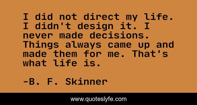 This page presents the quote "I did not direct my life. I didn't design it. I never made decisions. Things always came up and made them for me. That's what life is.". Author of this quote is B. F. Skinner. This quote is about me, life, decisions,.