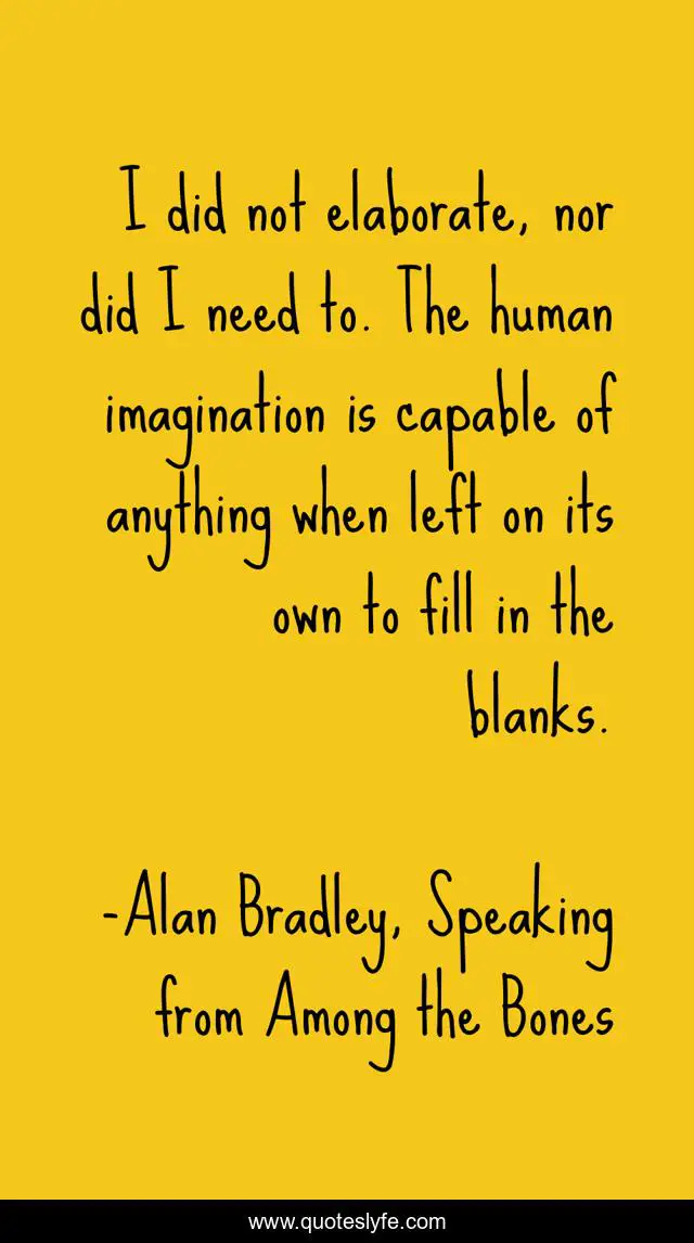 This page presents the quote "I did not elaborate, nor did I need to. The human imagination is capable of anything when left on its own to fill in the blanks.". Author of this quote is Alan Bradley, Speaking from Among the Bones. .