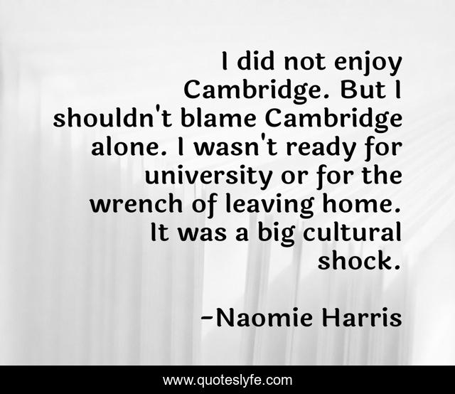 This page presents the quote "I did not enjoy Cambridge. But I shouldn't blame Cambridge alone. I wasn't ready for university or for the wrench of leaving home. It was a big cultural shock.". Author of this quote is Naomie Harris. This quote is about alone, blame, leaving,.