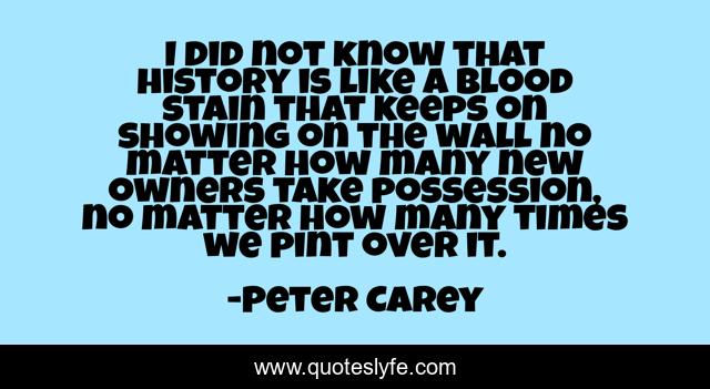 This page presents the quote "I did not know that history is like a blood stain that keeps on showing on the wall no matter how many new owners take possession, no matter how many times we pint over it.". Author of this quote is Peter Carey. This quote is about australia, history, sydney-aborigine,.