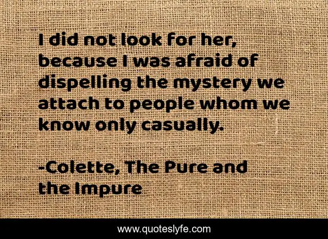 This page presents the quote "I did not look for her, because I was afraid of dispelling the mystery we attach to people whom we know only casually.". Author of this quote is Colette, The Pure and the Impure. This quote is about mystery, acquaintances, people,.