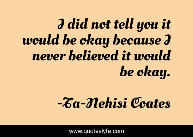 This page presents the quote "I did not tell you it would be okay because I never believed it would be okay.". Author of this quote is Ta-Nehisi Coates. This quote is about american-history, letter-to-my-son, slavery, police-brutality, racism,.