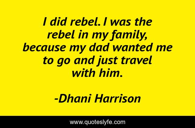 This page presents the quote "I did rebel. I was the rebel in my family, because my dad wanted me to go and just travel with him.". Author of this quote is Dhani Harrison. This quote is about me, rebel, family,.