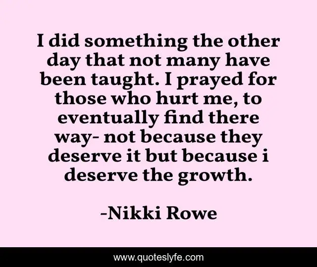 This page presents the quote "I did something the other day that not many have been taught. I prayed for those who hurt me, to eventually find there way- not because they deserve it but because i deserve the growth.". Author of this quote is Nikki Rowe. This quote is about light, growth, love, unconditional, affection,.