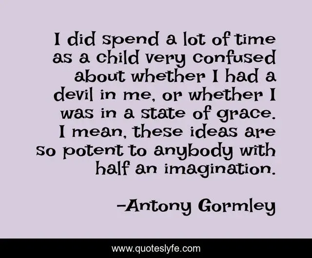 This page presents the quote "I did spend a lot of time as a child very confused about whether I had a devil in me, or whether I was in a state of grace. I mean, these ideas are so potent to anybody with half an imagination.". Author of this quote is Antony Gormley. This quote is about me, time, child,.