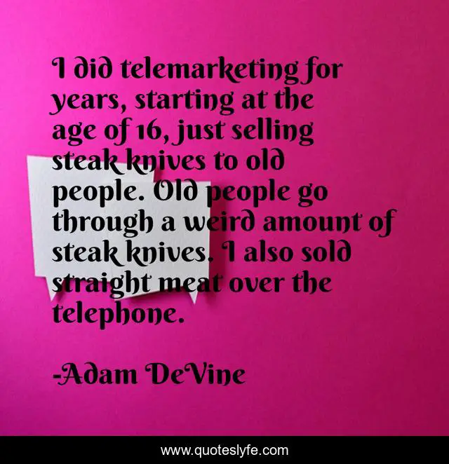 This page presents the quote "I did telemarketing for years, starting at the age of 16, just selling steak knives to old people. Old people go through a weird amount of steak knives. I also sold straight meat over the telephone.". Author of this quote is Adam DeVine. This quote is about weird, selling, people,.