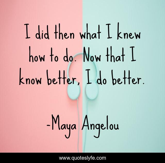 This page presents the quote "I did then what I knew how to do. Now that I know better, I do better.". Author of this quote is Maya Angelou. This quote is about intelligence, unsourced, education, knowledge, attributed,.