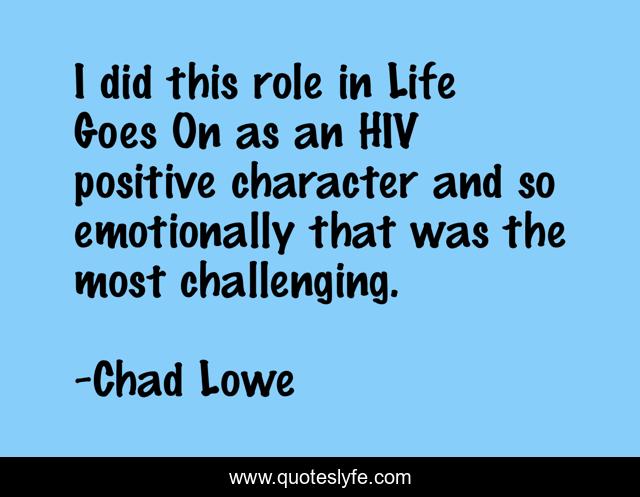 This page presents the quote "I did this role in Life Goes On as an HIV positive character and so emotionally that was the most challenging.". Author of this quote is Chad Lowe. This quote is about life, character,.