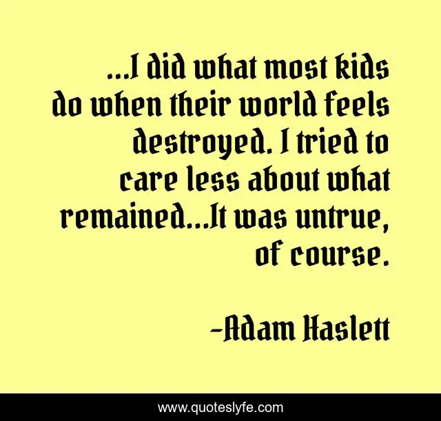 This page presents the quote "...I did what most kids do when their world feels destroyed. I tried to care less about what remained...It was untrue, of course.". Author of this quote is Adam Haslett. This quote is about loss, loneliness,.