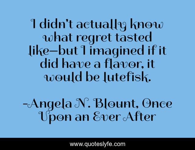This page presents the quote "I didn't actually know what regret tasted like—but I imagined if it did have a flavor, it would be lutefisk.". Author of this quote is Angela N. Blount, Once Upon an Ever After. This quote is about funny, comedy, funny-and-random, lutefisk, regret,.