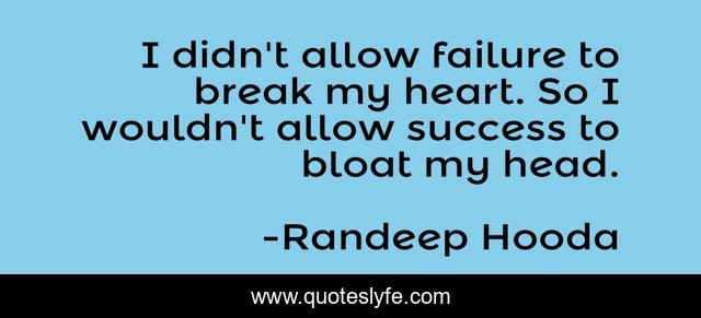 This page presents the quote "I didn't allow failure to break my heart. So I wouldn't allow success to bloat my head.". Author of this quote is Randeep Hooda. This quote is about heart, head, success,.