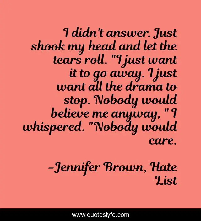 This page presents the quote "I didn't answer. Just shook my head and let the tears roll. "I just want it to go away. I just want all the drama to stop. Nobody would believe me anyway, " I whispered. "Nobody would care.". Author of this quote is Jennifer Brown, Hate List. This quote is about hopelessness, depression,.