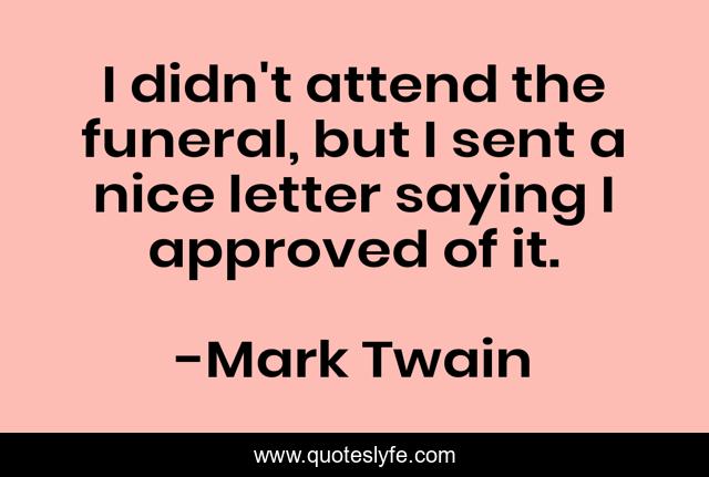 This page presents the quote "I didn't attend the funeral, but I sent a nice letter saying I approved of it.". Author of this quote is Mark Twain. This quote is about saying, funeral, nice,.