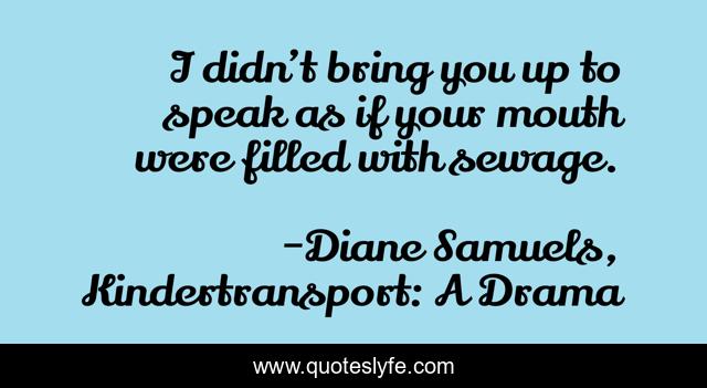 This page presents the quote "I didn’t bring you up to speak as if your mouth were filled with sewage.". Author of this quote is Diane Samuels, Kindertransport: A Drama. This quote is about play, languages-and-culture, kindertransport, advice, swearing, family-relationships, teenagers-and-parents,.