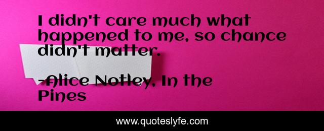 This page presents the quote "I didn't care much what happened to me, so chance didn't matter.". Author of this quote is Alice Notley, In the Pines. This quote is about in-the-pines, chance, apathy, alice-notley,.
