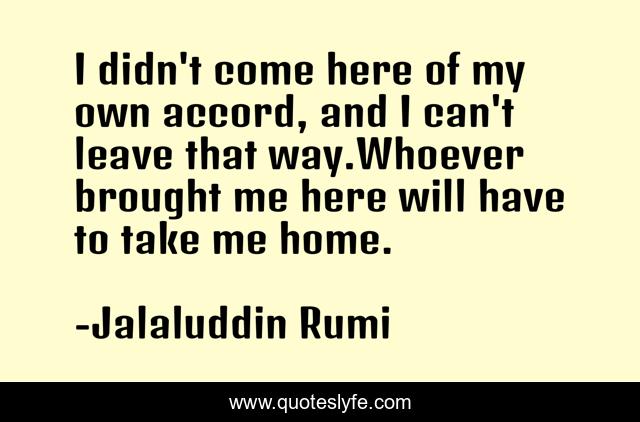 This page presents the quote "I didn't come here of my own accord, and I can't leave that way.Whoever brought me here will have to take me home.". Author of this quote is Jalaluddin Rumi. This quote is about enthusiasm, inspirational,.