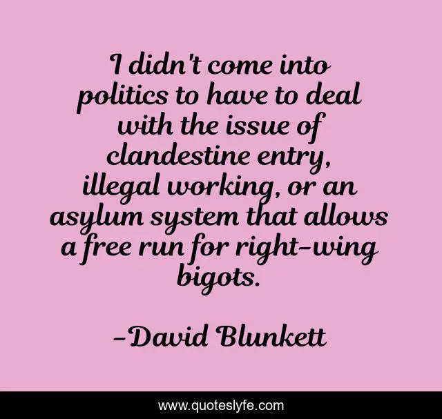 This page presents the quote "I didn't come into politics to have to deal with the issue of clandestine entry, illegal working, or an asylum system that allows a free run for right-wing bigots.". Author of this quote is David Blunkett. This quote is about run, free, working,.