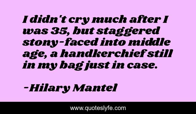 This page presents the quote "I didn't cry much after I was 35, but staggered stony-faced into middle age, a handkerchief still in my bag just in case.". Author of this quote is Hilary Mantel. This quote is about bag, cry, just,.