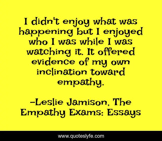 This page presents the quote "I didn't enjoy what was happening but I enjoyed who I was while I was watching it. It offered evidence of my own inclination toward empathy.". Author of this quote is Leslie Jamison, The Empathy Exams: Essays. .