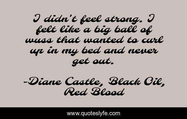 This page presents the quote "I didn't feel strong. I felt like a big ball of wuss that wanted to curl up in my bed and never get out.". Author of this quote is Diane Castle, Black Oil, Red Blood. This quote is about humorous, humor, humour,.