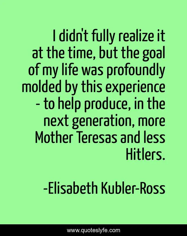 This page presents the quote "I didn't fully realize it at the time, but the goal of my life was profoundly molded by this experience - to help produce, in the next generation, more Mother Teresas and less Hitlers.". Author of this quote is Elisabeth Kubler-Ross. This quote is about life, time, mother,.