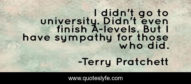 This page presents the quote "I didn't go to university. Didn't even finish A-levels. But I have sympathy for those who did.". Author of this quote is Terry Pratchett. This quote is about go, university, finish,.