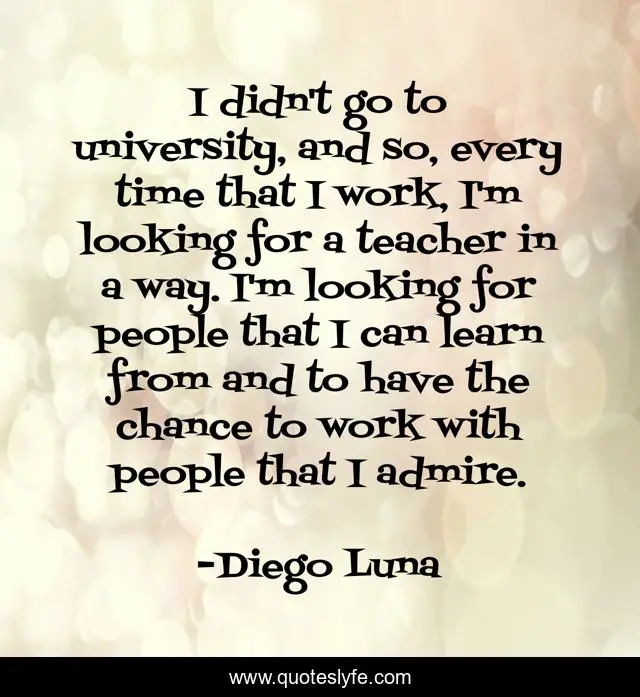 This page presents the quote "I didn't go to university, and so, every time that I work, I'm looking for a teacher in a way. I'm looking for people that I can learn from and to have the chance to work with people that I admire.". Author of this quote is Diego Luna. This quote is about work, time, people,.