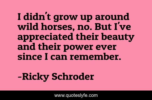 This page presents the quote "I didn't grow up around wild horses, no. But I've appreciated their beauty and their power ever since I can remember.". Author of this quote is Ricky Schroder. This quote is about grow, power, remember,.