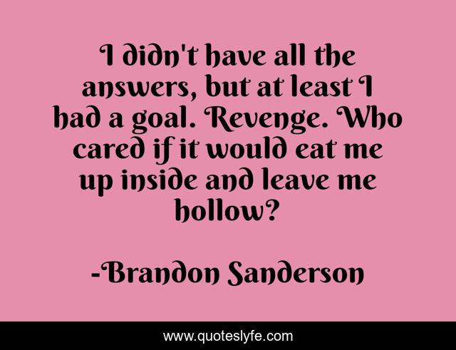 This page presents the quote "I didn't have all the answers, but at least I had a goal. Revenge. Who cared if it would eat me up inside and leave me hollow?". Author of this quote is Brandon Sanderson. This quote is about strong-willed, sad,.