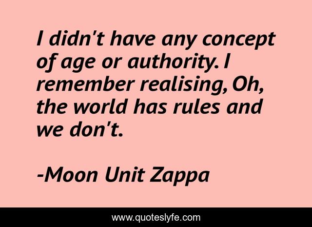 This page presents the quote "I didn't have any concept of age or authority. I remember realising, Oh, the world has rules and we don't.". Author of this quote is Moon Unit Zappa. This quote is about rules, world, remember,.