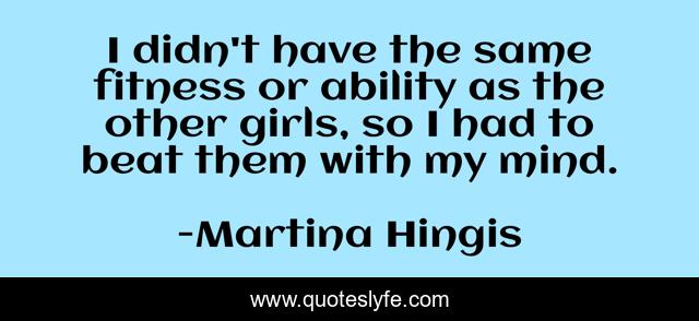 This page presents the quote "I didn't have the same fitness or ability as the other girls, so I had to beat them with my mind.". Author of this quote is Martina Hingis. This quote is about mind, ability, same,.