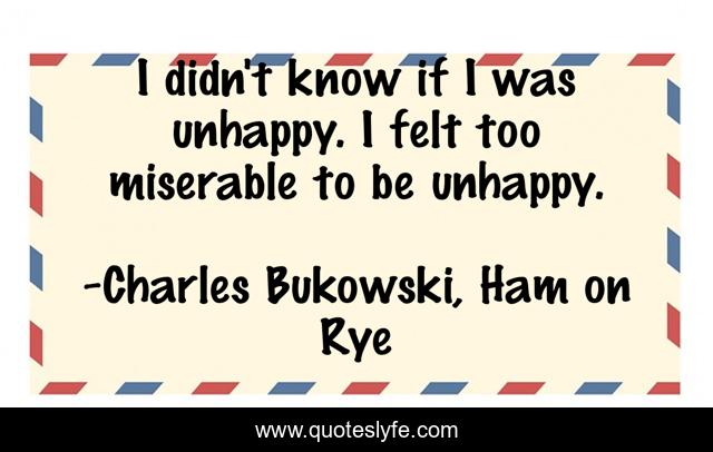 This page presents the quote "I didn't know if I was unhappy. I felt too miserable to be unhappy.". Author of this quote is Charles Bukowski, Ham on Rye. .