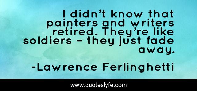 This page presents the quote "I didn’t know that painters and writers retired. They’re like soldiers – they just fade away.". Author of this quote is Lawrence Ferlinghetti. This quote is about retirement, paraphrased, writers,.