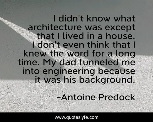 This page presents the quote "I didn't know what architecture was except that I lived in a house. I don't even think that I knew the word for a long time. My dad funneled me into engineering because it was his background.". Author of this quote is Antoine Predock. This quote is about me, engineering, time,.