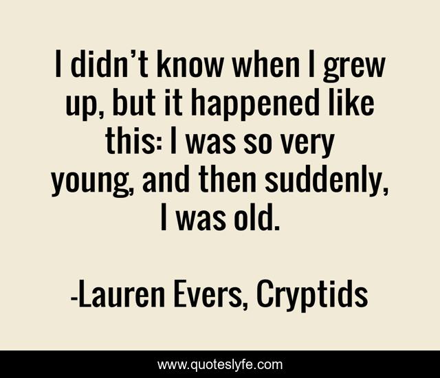 This page presents the quote "I didn’t know when I grew up, but it happened like this: I was so very young, and then suddenly, I was old.". Author of this quote is Lauren Evers, Cryptids. This quote is about quote, age, cryptids,.