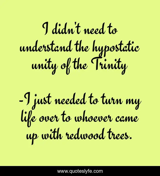 This page presents the quote "I didn't need to understand the hypostatic unity of the Trinity". Author of this quote is I just needed to turn my life over to whoever came up with redwood trees.. This quote is about plan b: further thoughts on faith, anne lamott,.