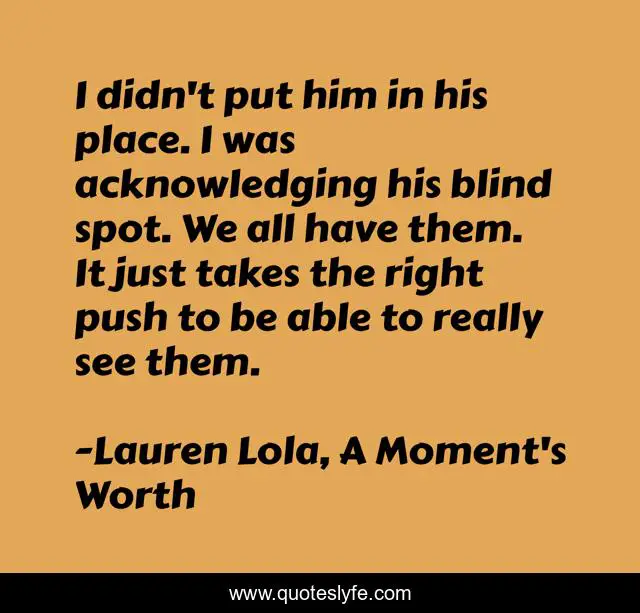 This page presents the quote "I didn't put him in his place. I was acknowledging his blind spot. We all have them. It just takes the right push to be able to really see them.". Author of this quote is Lauren Lola, A Moment's Worth. This quote is about blind-spot, contemporary,.