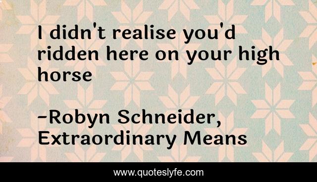 This page presents the quote "I didn't realise you'd ridden here on your high horse". Author of this quote is Robyn Schneider, Extraordinary Means. This quote is about ya, young-adult, humour,.