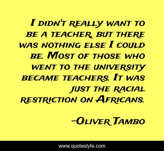 This page presents the quote "I didn't really want to be a teacher, but there was nothing else I could be. Most of those who went to the university became teachers. It was just the racial restriction on Africans.". Author of this quote is Oliver Tambo. This quote is about nothing, teachers,.