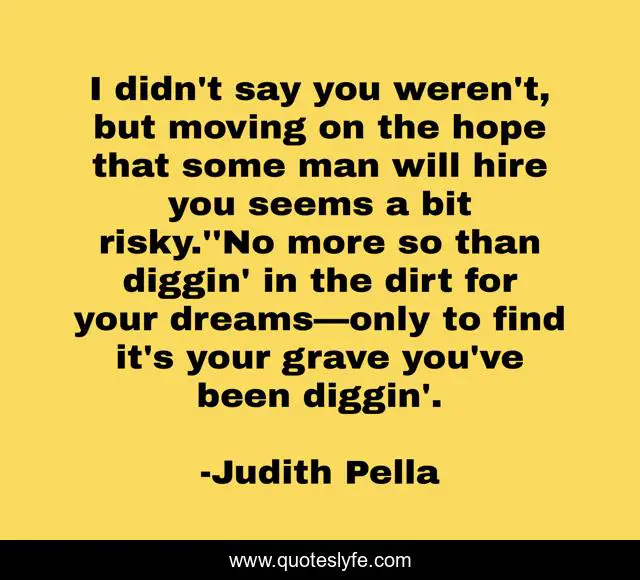 This page presents the quote "I didn't say you weren't, but moving on the hope that some man will hire you seems a bit risky.''No more so than diggin' in the dirt for your dreams—only to find it's your grave you've been diggin'.". Author of this quote is Judith Pella. This quote is about dreams, hope,.
