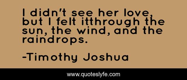 This page presents the quote "I didn't see her love, but I felt itthrough the sun, the wind, and the raindrops.". Author of this quote is Timothy Joshua. This quote is about lovers, love, affection,.