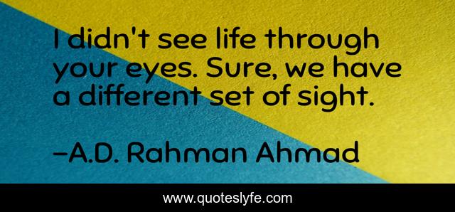 This page presents the quote "I didn't see life through your eyes. Sure, we have a different set of sight.". Author of this quote is A.D. Rahman Ahmad. .